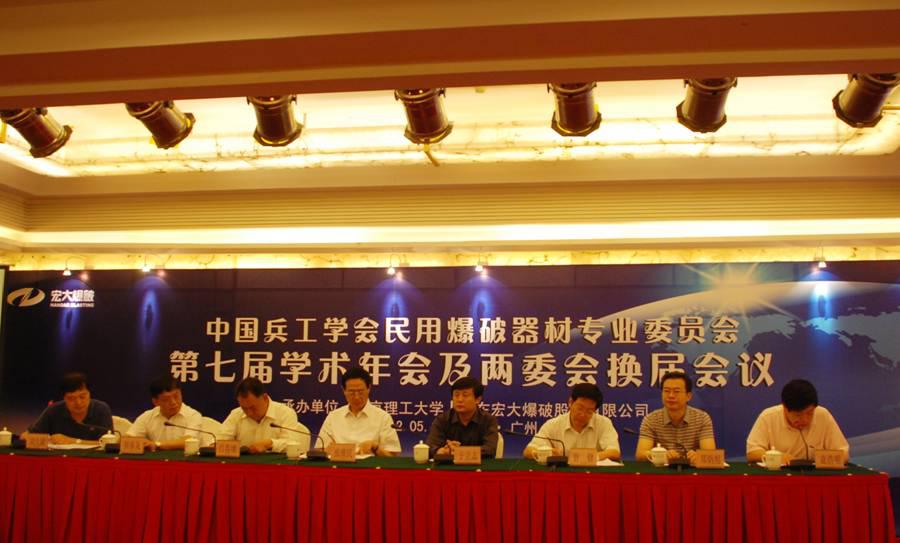 中国兵工学会民用爆破器材专业委员会第七届学术年会暨中国兵工学会民用爆破器材专业委员会和《爆破器材》杂志编委会(以下简称“两委”)换届聚会于2012年5月17-19日在广州大厦召开。本次聚会由中国兵工学会民用爆破器材专业委员会主理,广东耀世娱乐爆破股份有限公司和南京理工大学承办。本次聚会议程主要有两委委员换届、学术年会特邀专题报告、分组学术交流与两委委员聚会。